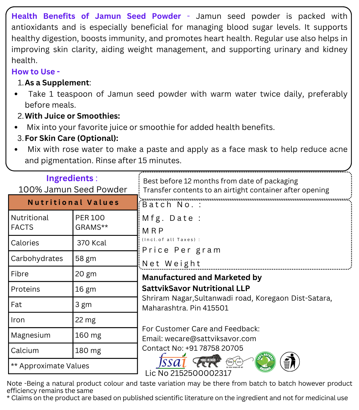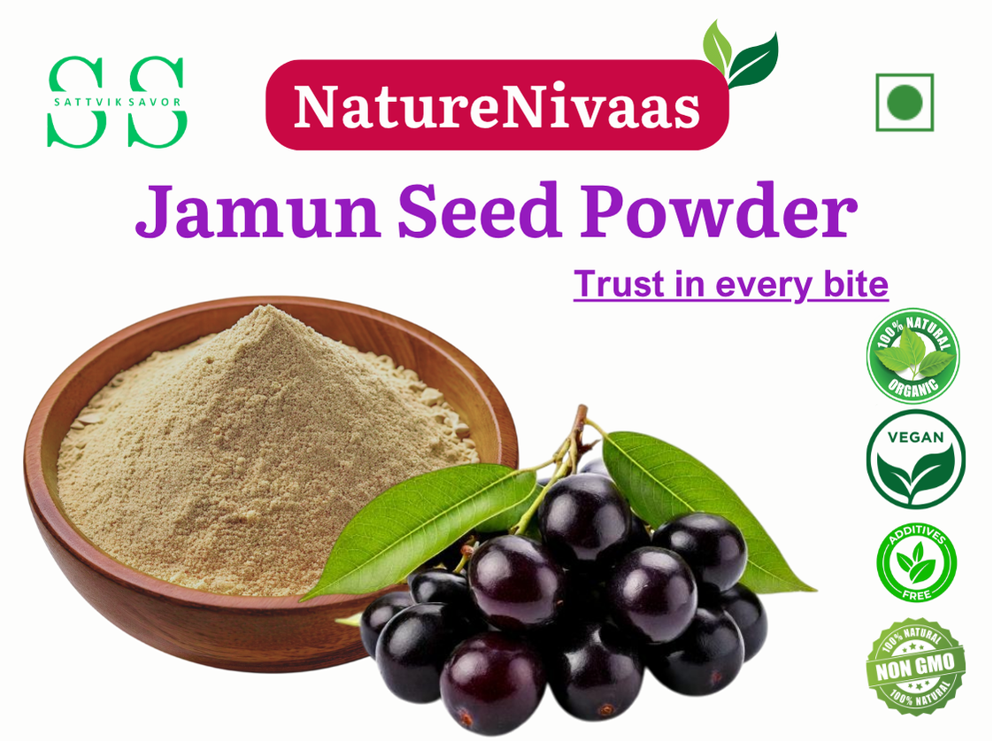 Unlock the health benefits of Jamun Seed Powder, a 100% natural herbal supplement made from carefully dried and powdered Jamun (Indian Blackberry) seeds. Rich in antioxidants, flavonoids, and alkaloids, this powder is well-known in Ayurveda for supporting blood sugar management, improving digestion, and boosting immunity.