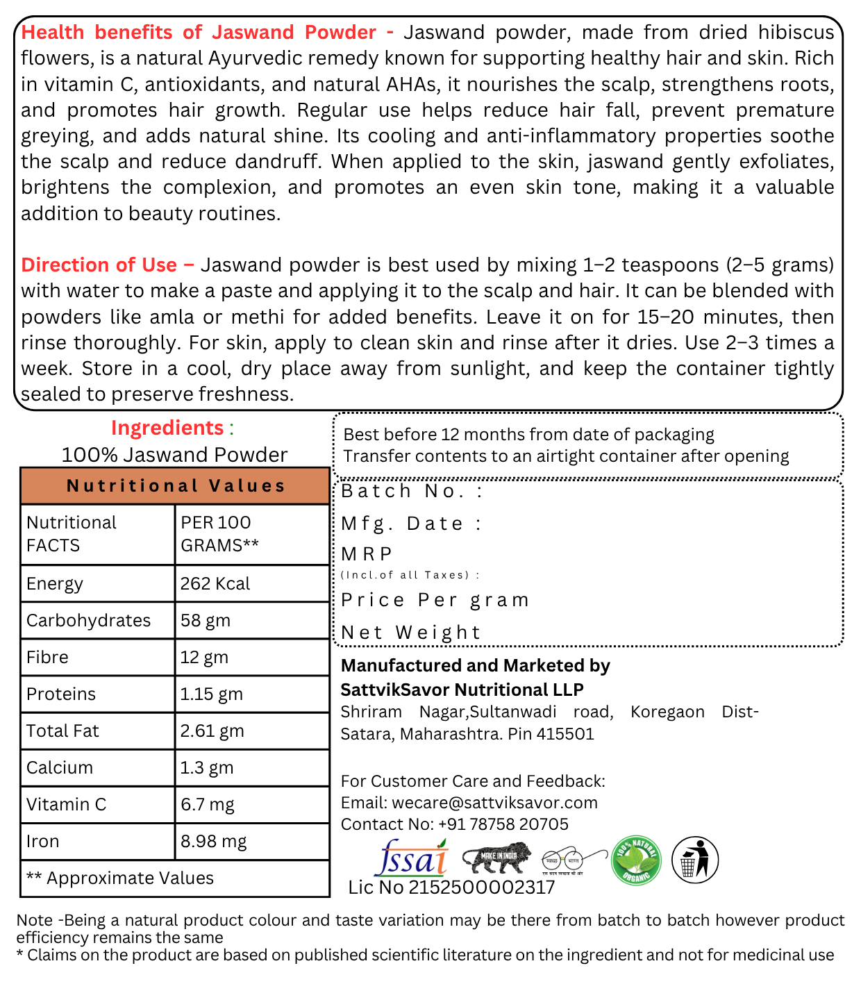 Mix Jaswand Powder with water, aloe vera gel, or curd. Apply to scalp and hair. Leave for 30 minutes, then rinse with mild shampoo.