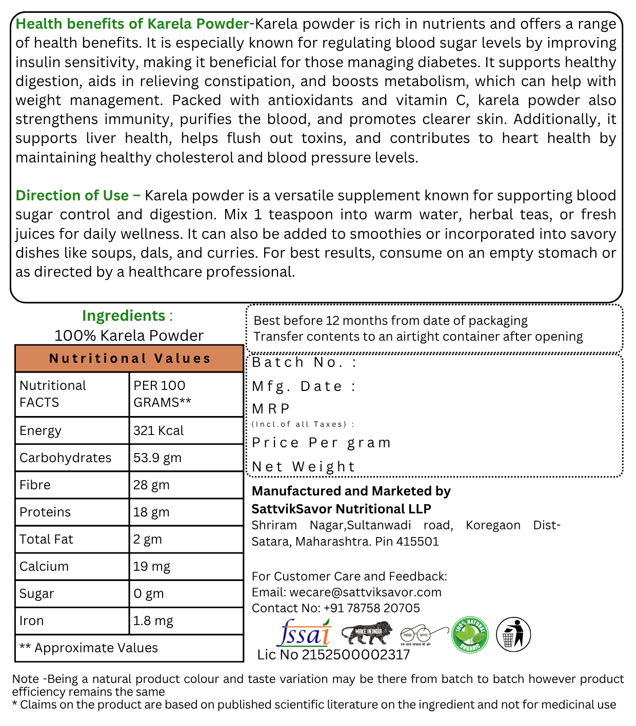 As a Supplement: Mix 1 tsp (3–5g) of Karela Powder with warm water, herbal tea, or juice. Consume once or twice daily, preferably before meals.