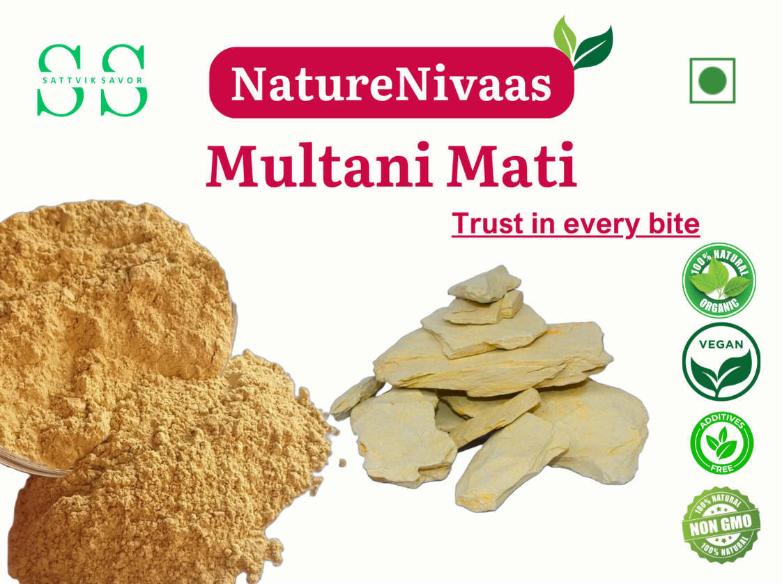 Multani Mitti, also known as Fuller’s Earth, is a mineral-rich clay used for centuries in Ayurvedic and natural skincare. Sourced from natural deposits, this beige-colored powder is renowned for its deep-cleansing and oil-absorbing properties, making it a favorite for clear, glowing skin.